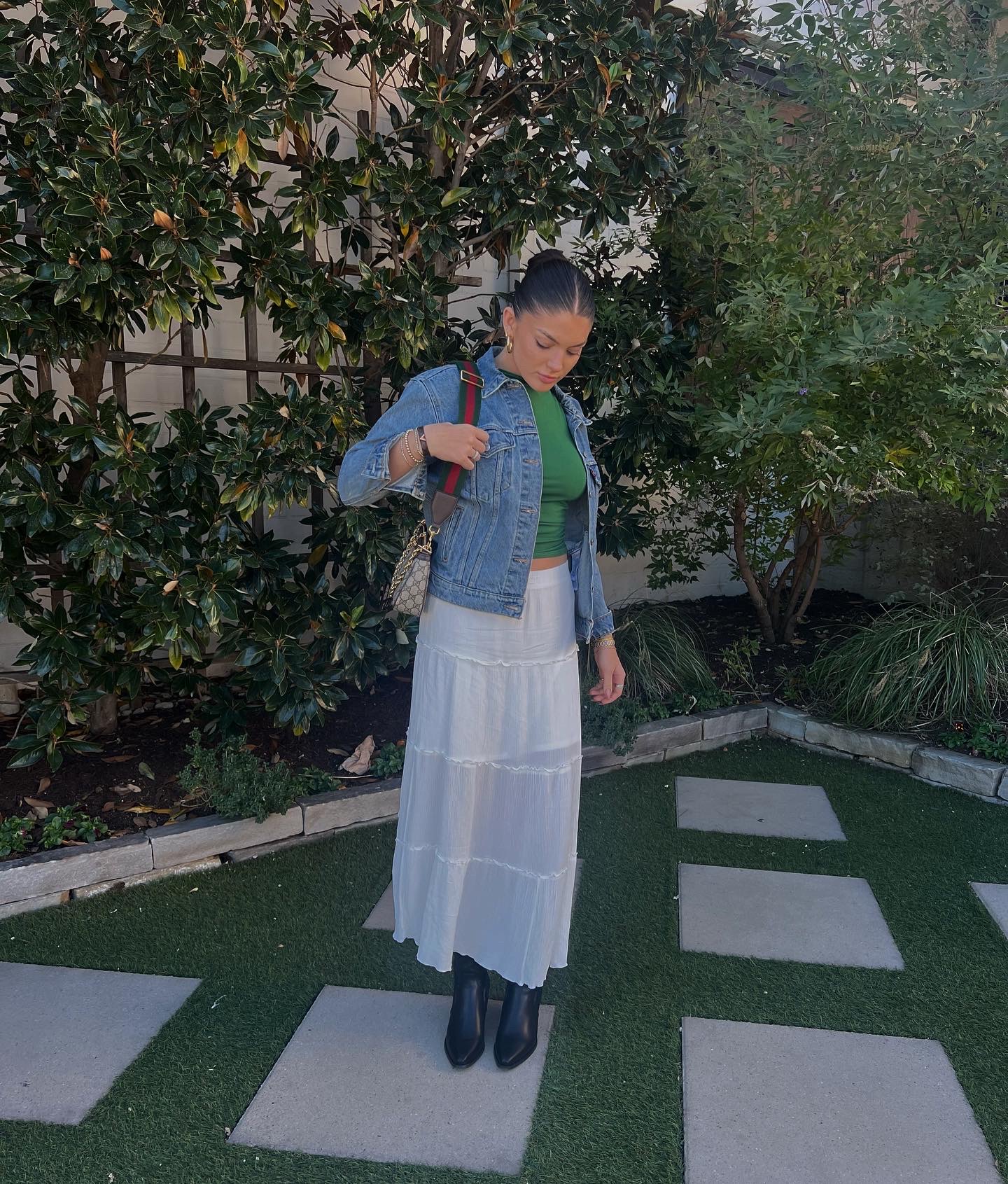 My favorite way to wear is a mini skirt, baby tee and tall black boots! But it also looks so cute with jeans, a t-shirt and boots or sneakers.